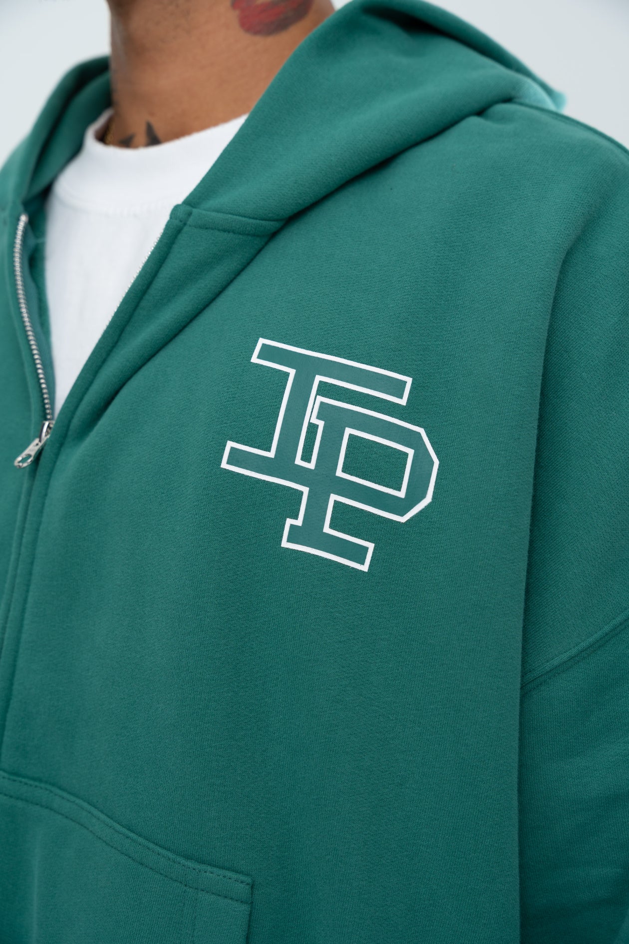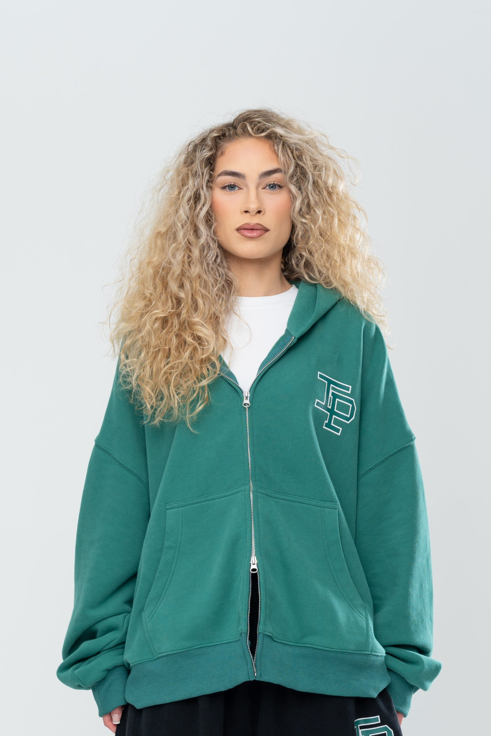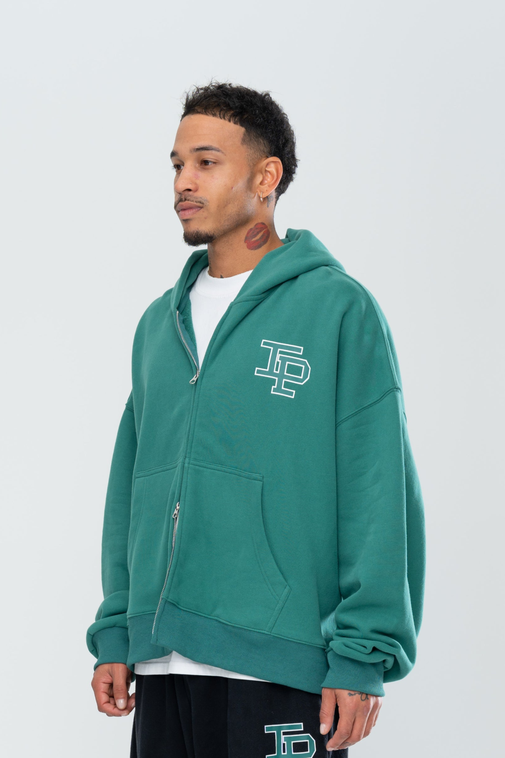 The Classic Double Zip Hoodie in Forest Green is constructed with an oversized boxy silhouette and an ultra-premium heavy-weight brushed french terry cotton. Hand distressing details throughout the hem and cuffs provide a unique finish for each garment. Finished with a 2-way zip for fit customization and screen printed branding to the front.