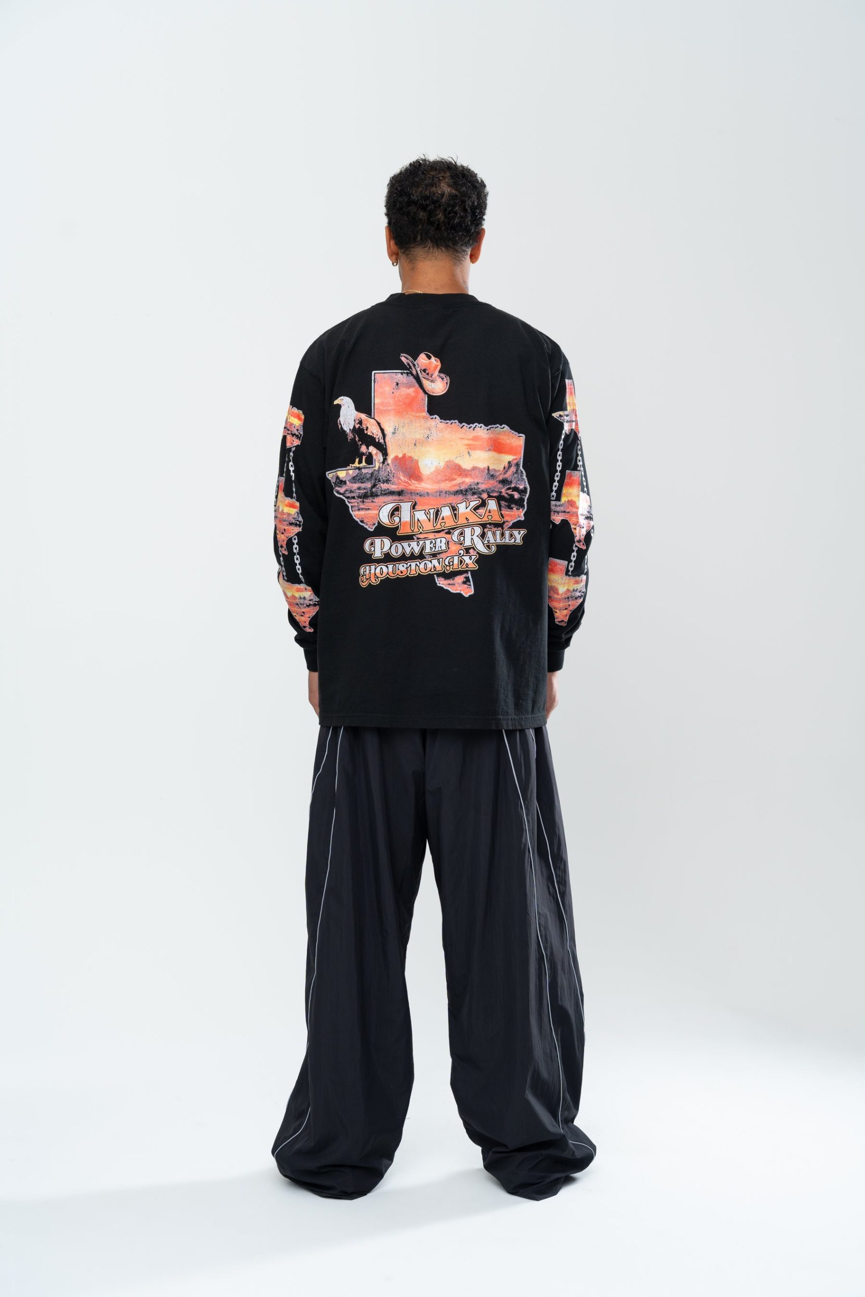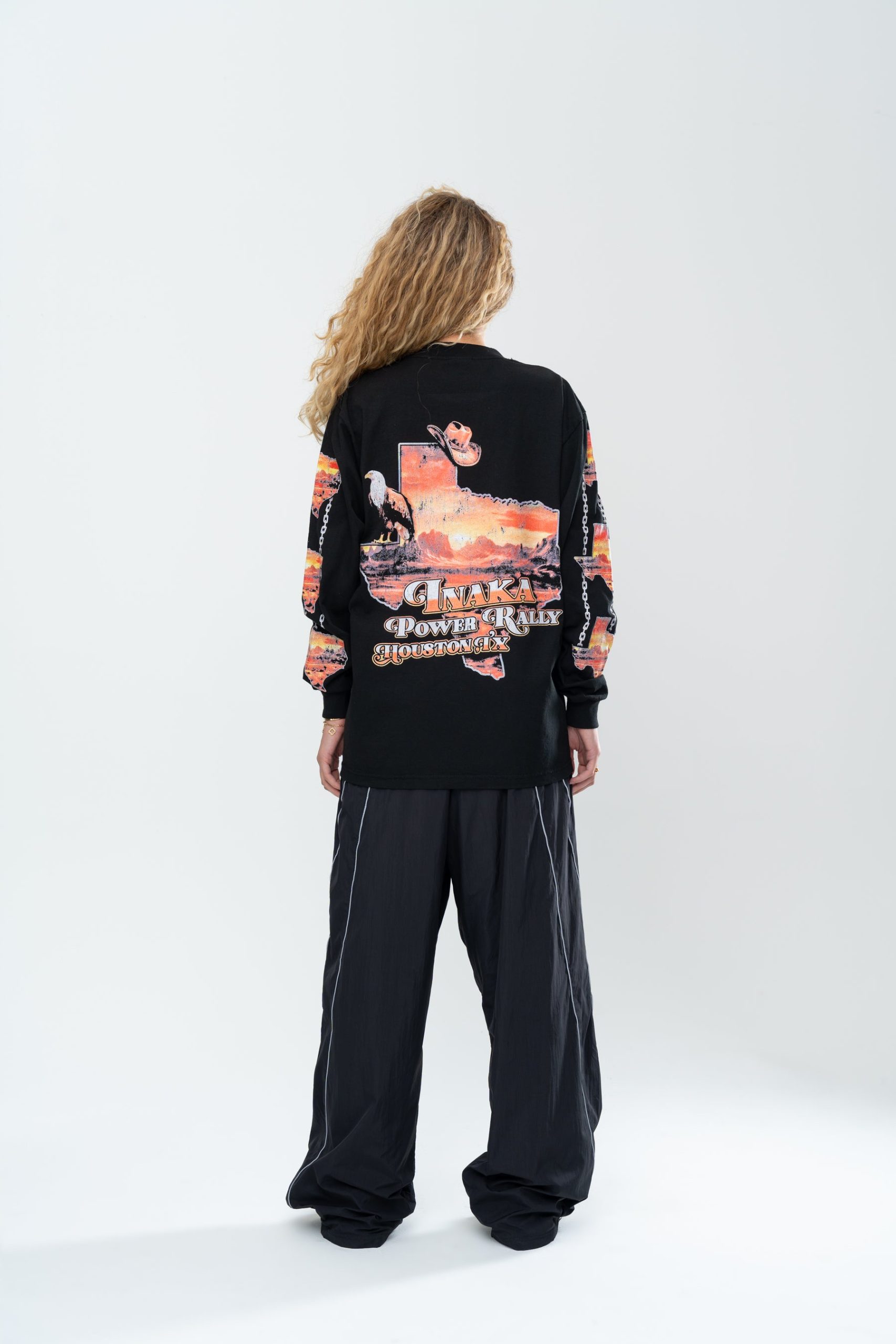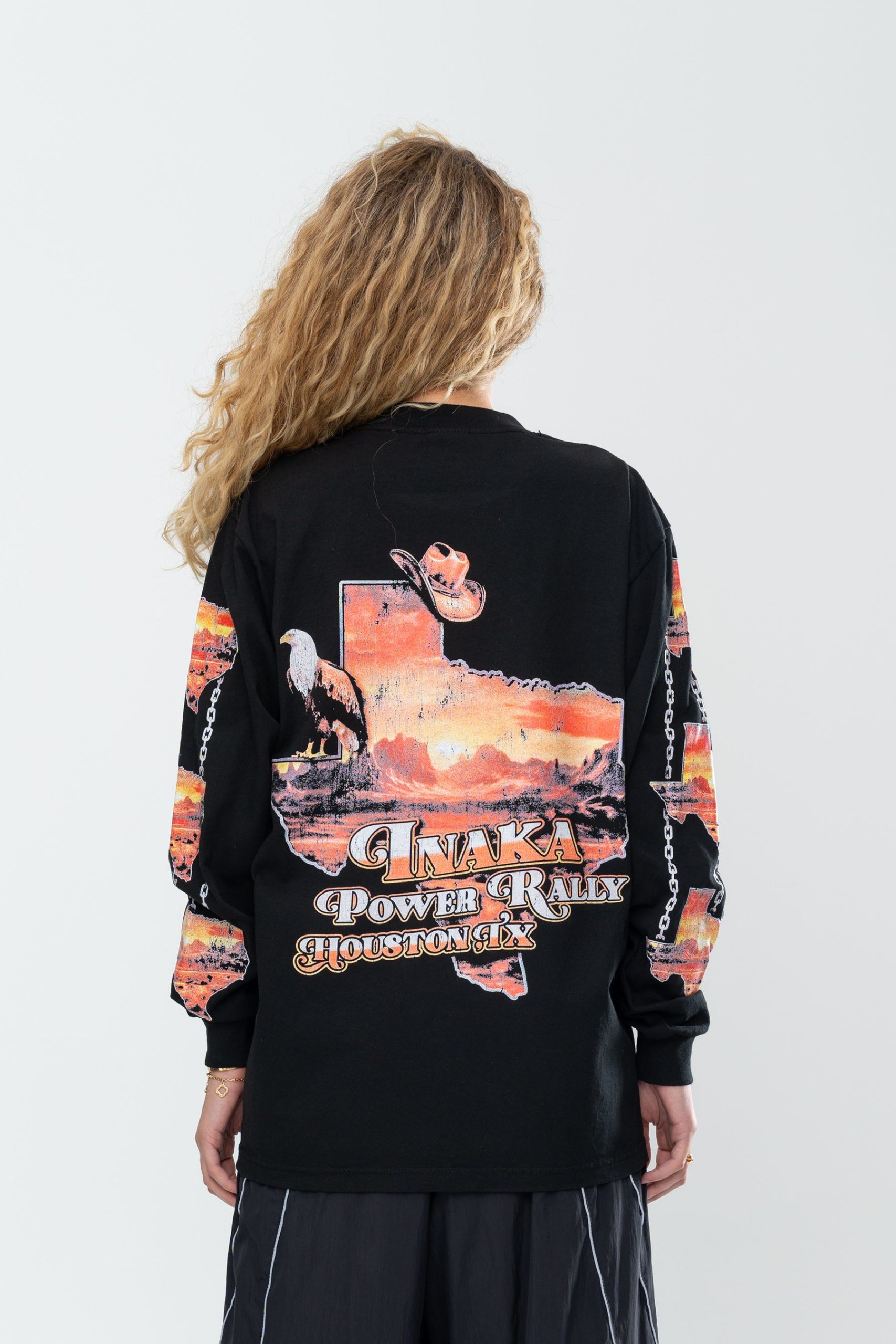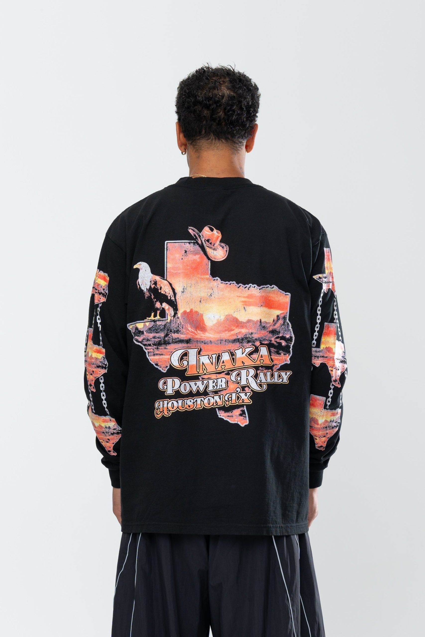 Introducing the Inaka Outlaws Long Sleeve in Pigment Black. This t-shirt features an enlarged screen printed front graphic. Crafted from a 16 singles 250 GSM jersey cotton. Treated with a pigment reactive dyeing process that achieves a washed-out, faded look. Finished with a boxy trim for a timeless, vintage feel.