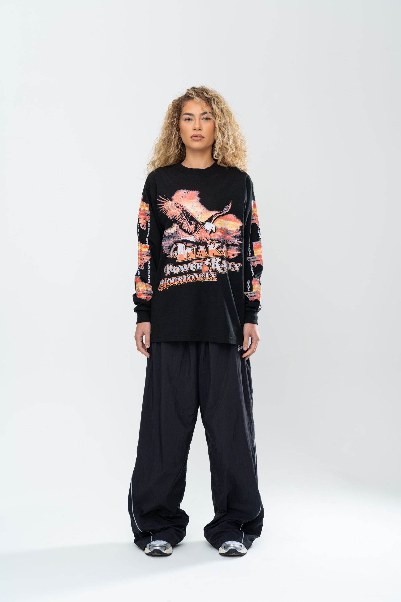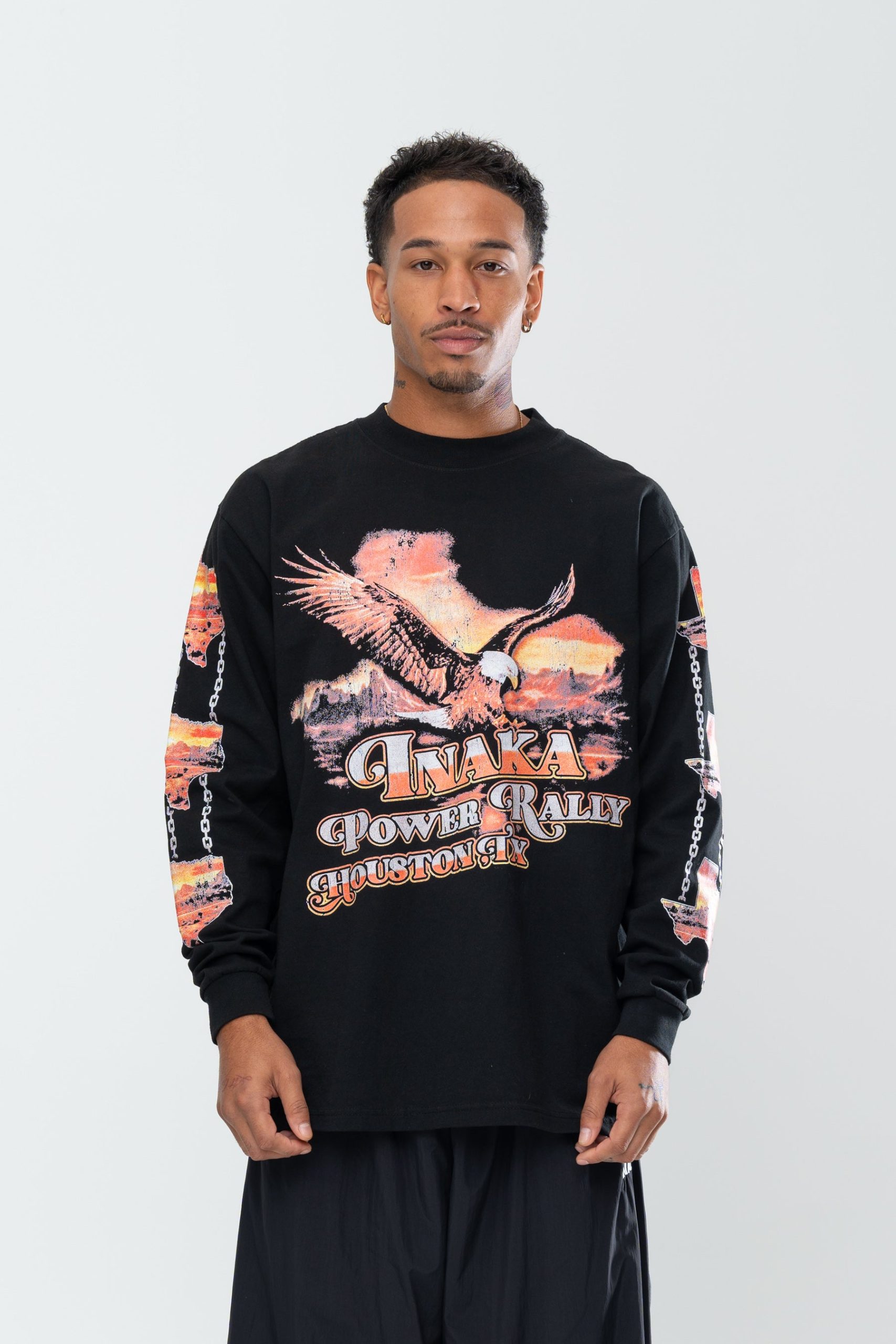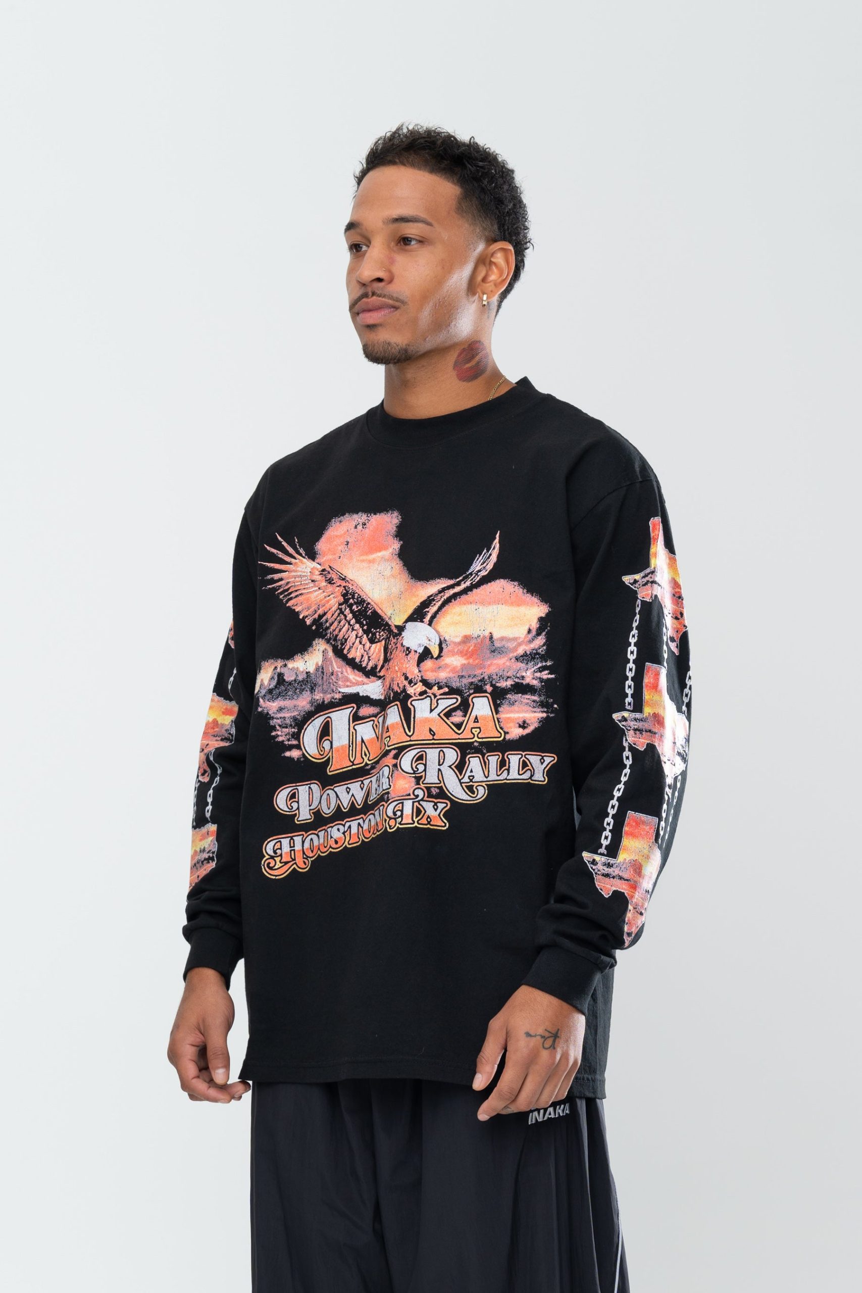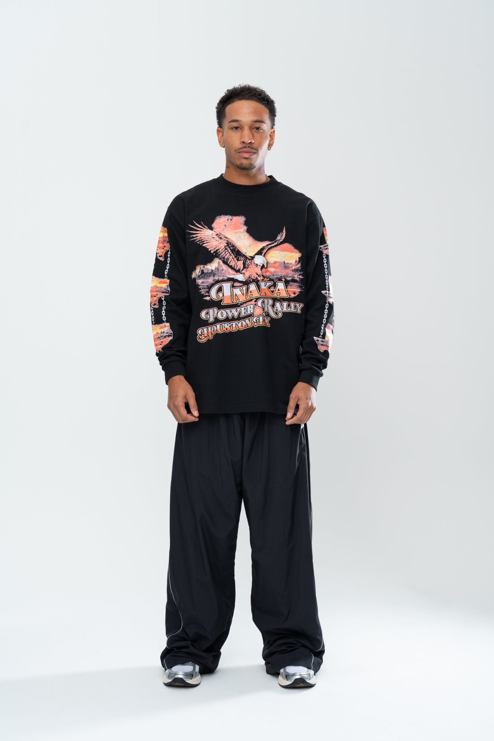 Introducing the Inaka Outlaws Long Sleeve in Pigment Black. This t-shirt features an enlarged screen printed front graphic. Crafted from a 16 singles 250 GSM jersey cotton. Treated with a pigment reactive dyeing process that achieves a washed-out, faded look. Finished with a boxy trim for a timeless, vintage feel.