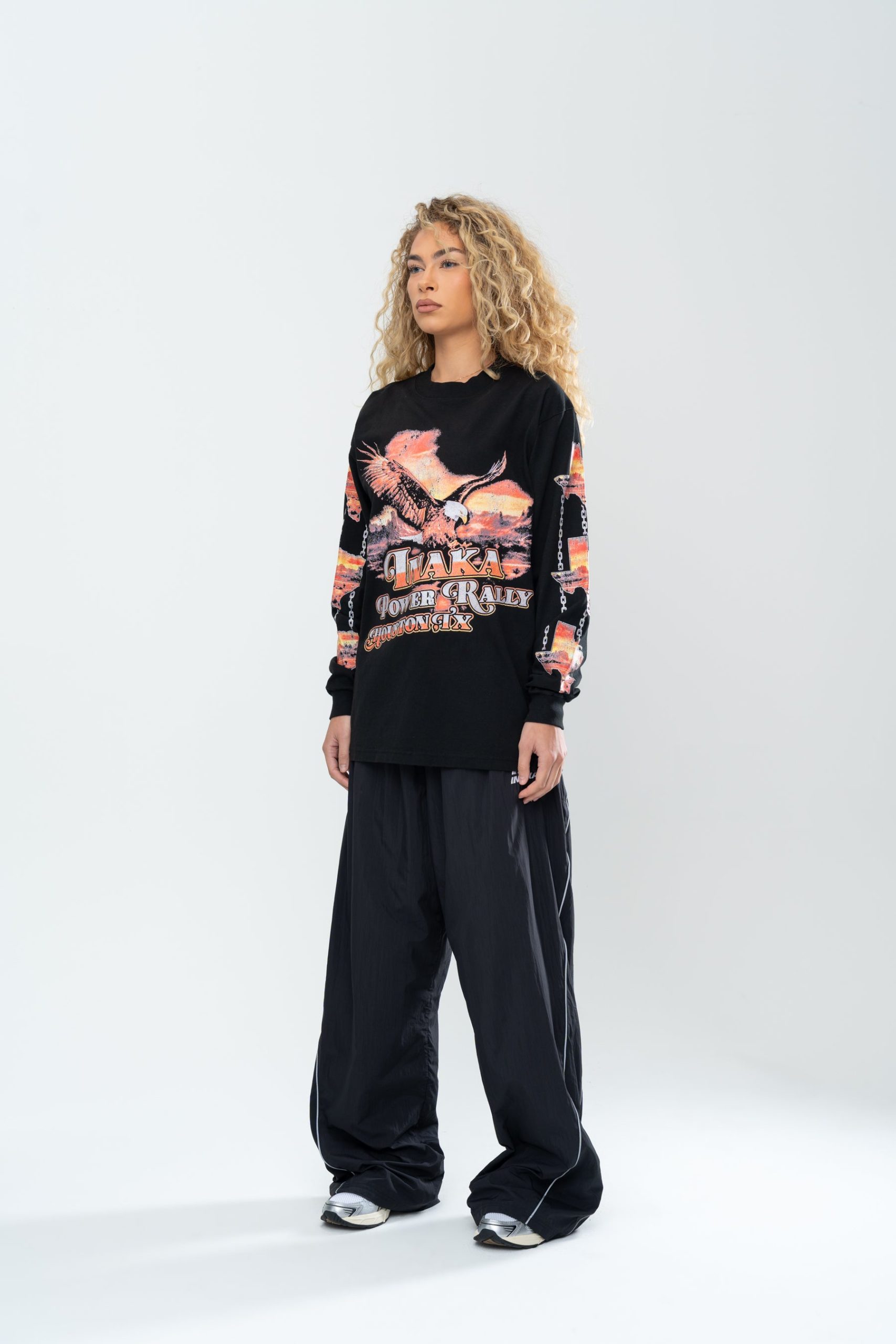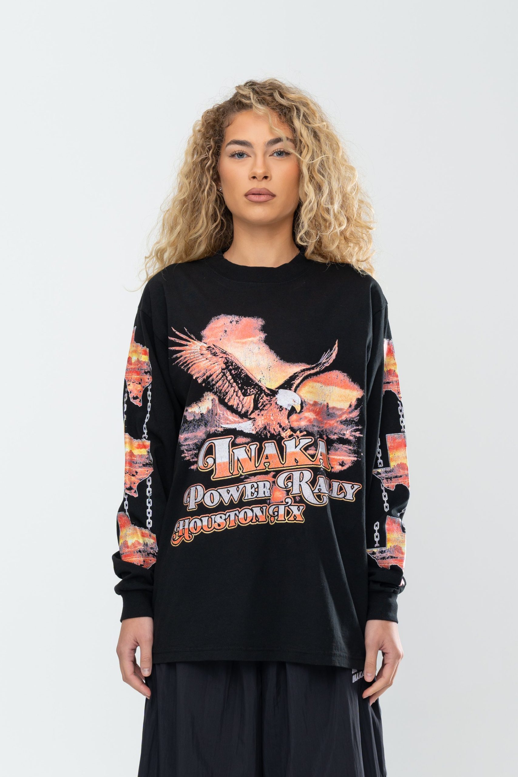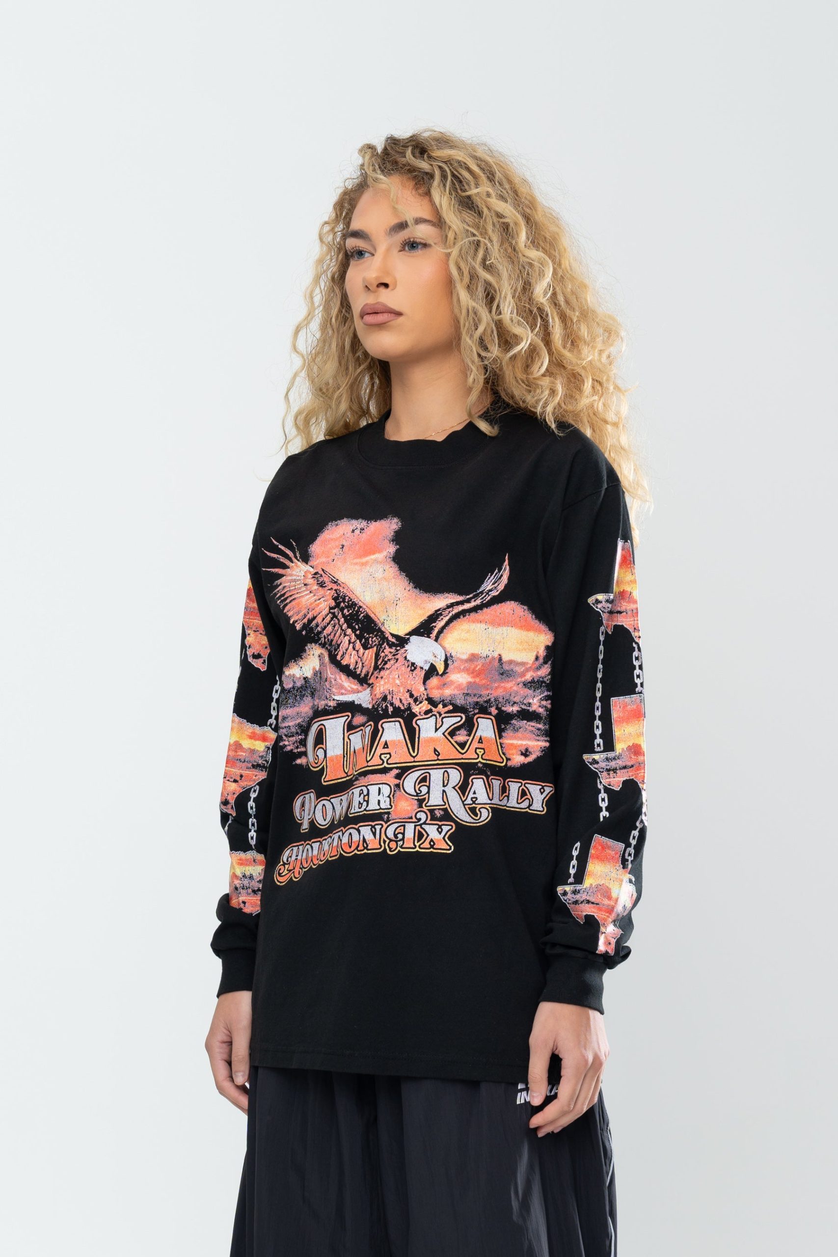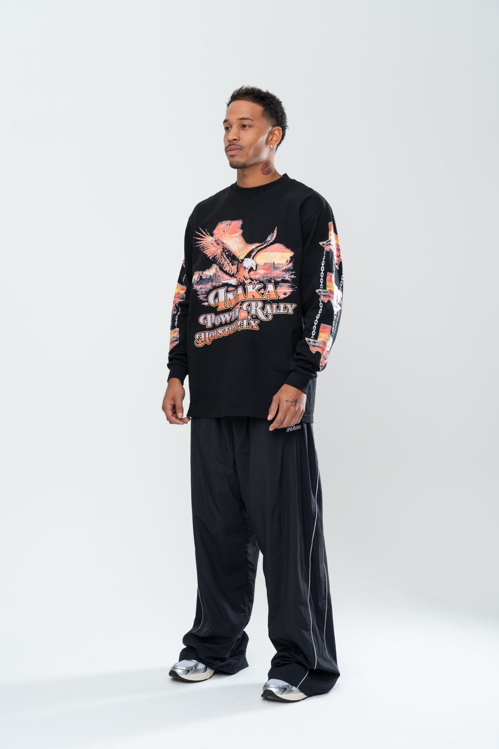 Introducing the Inaka Outlaws Long Sleeve in Pigment Black. This t-shirt features an enlarged screen printed front graphic. Crafted from a 16 singles 250 GSM jersey cotton. Treated with a pigment reactive dyeing process that achieves a washed-out, faded look. Finished with a boxy trim for a timeless, vintage feel.