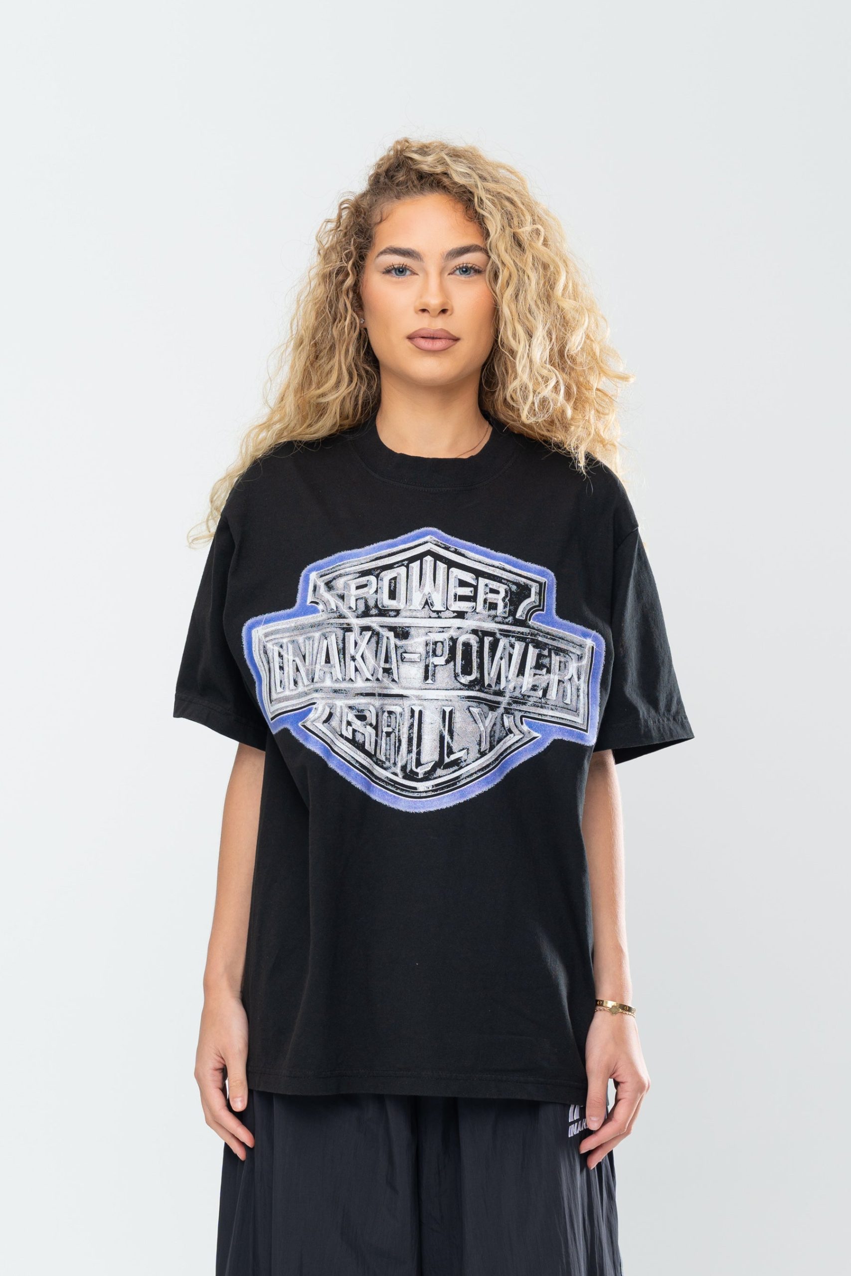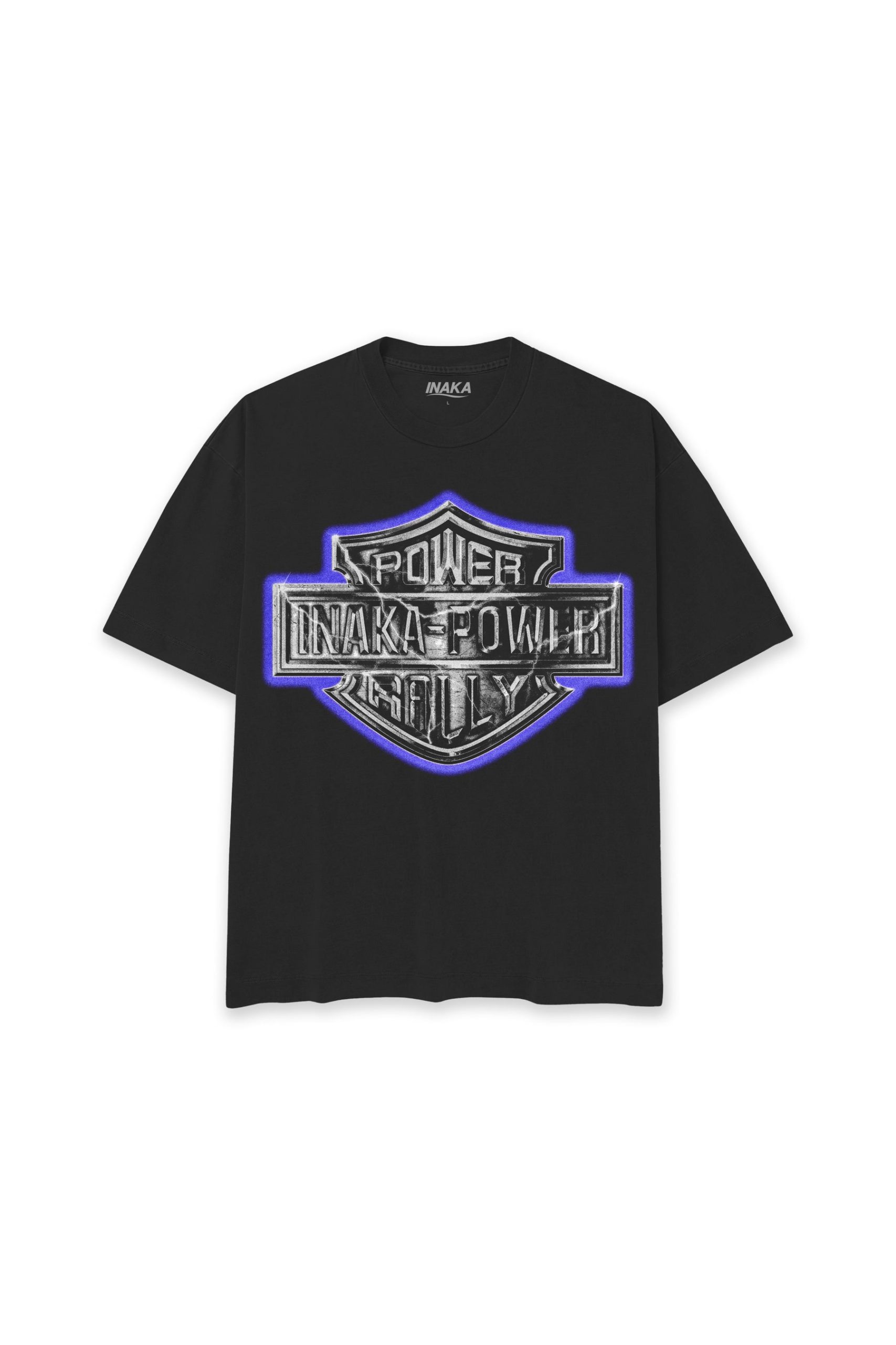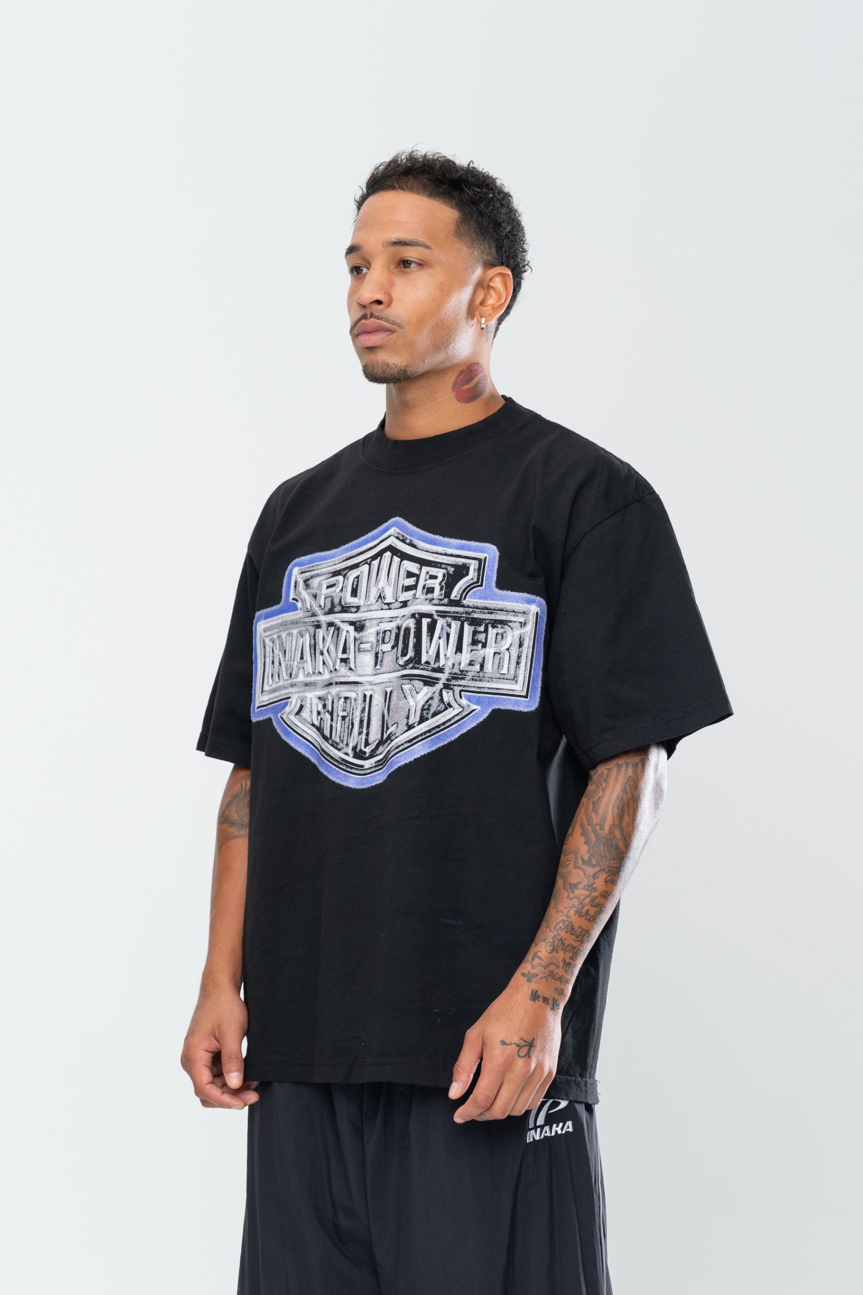 Introducing the Inaka Power Rally Tee in Pigment Black. This t-shirt features an enlarged screen printed front graphic. Crafted from a 16 singles 250 GSM jersey cotton. Treated with a pigment reactive dyeing process that achieves a washed-out, faded look. Finished with a boxy trim for a timeless, vintage feel.