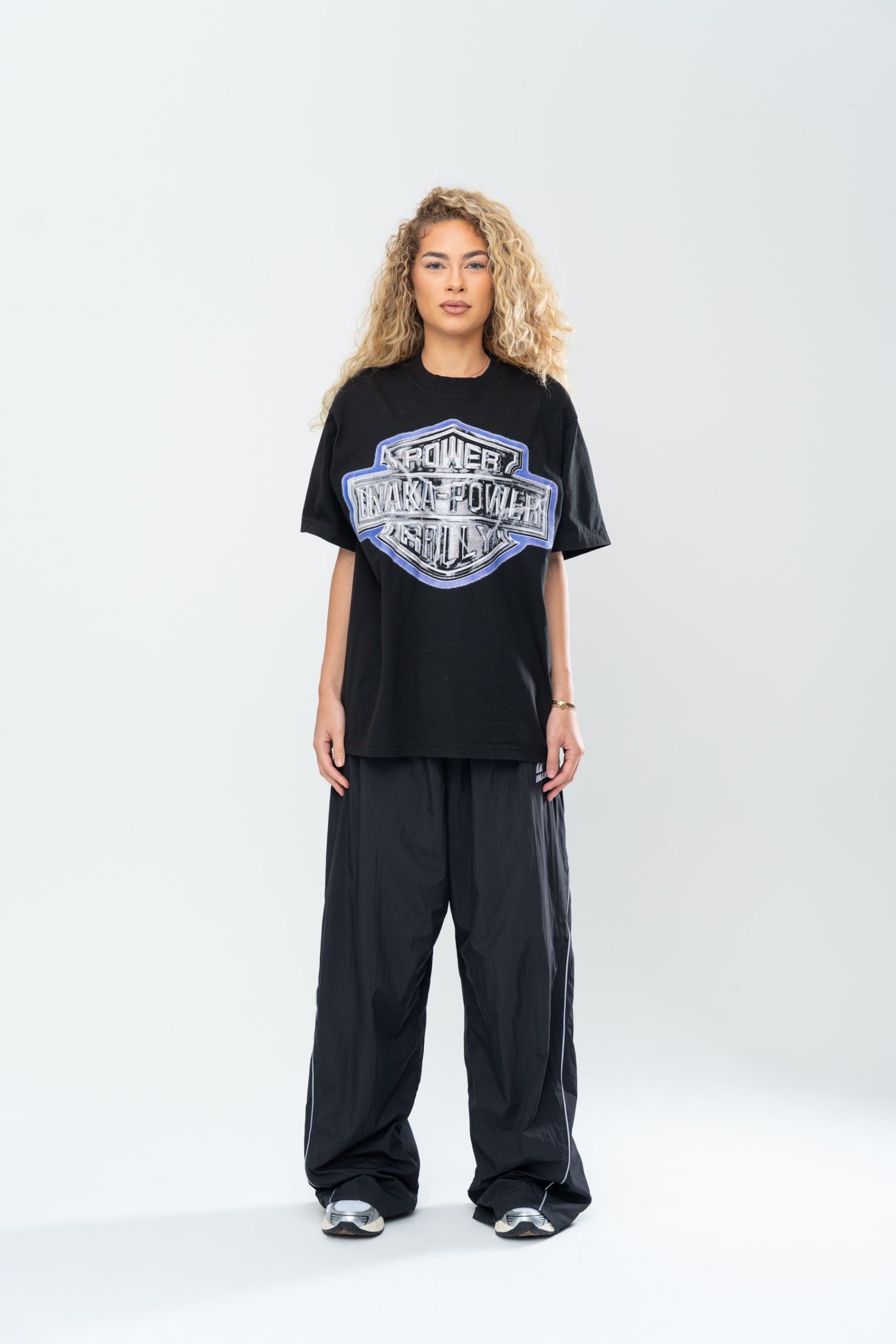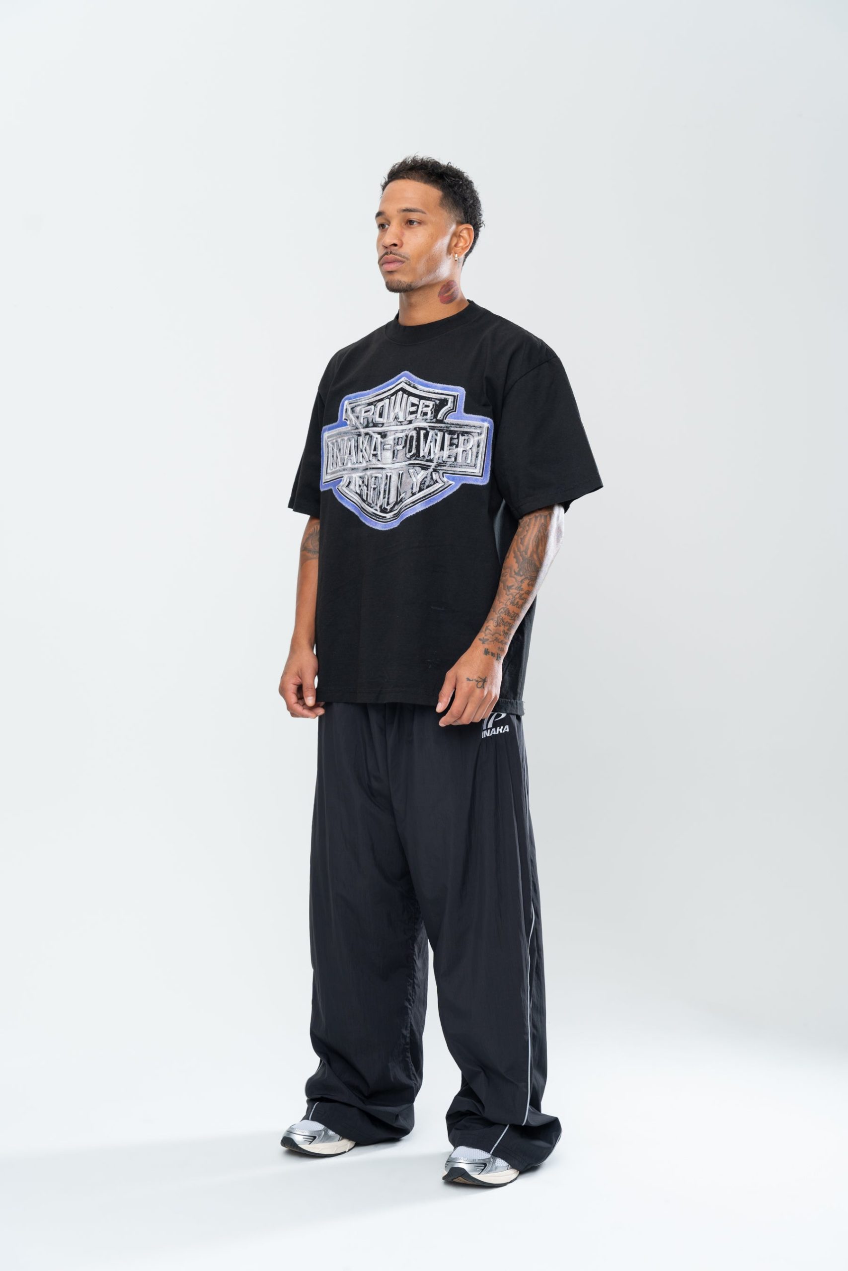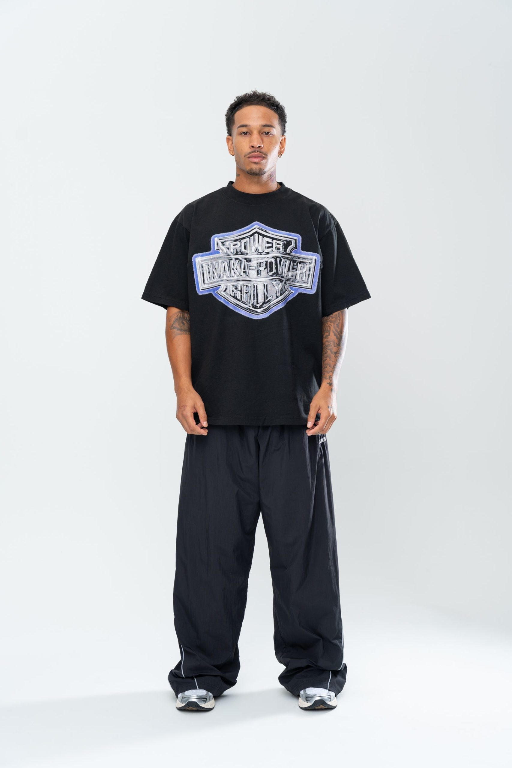 Introducing the Inaka Power Rally Tee in Pigment Black. This t-shirt features an enlarged screen printed front graphic. Crafted from a 16 singles 250 GSM jersey cotton. Treated with a pigment reactive dyeing process that achieves a washed-out, faded look. Finished with a boxy trim for a timeless, vintage feel.