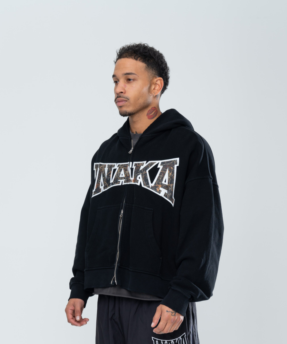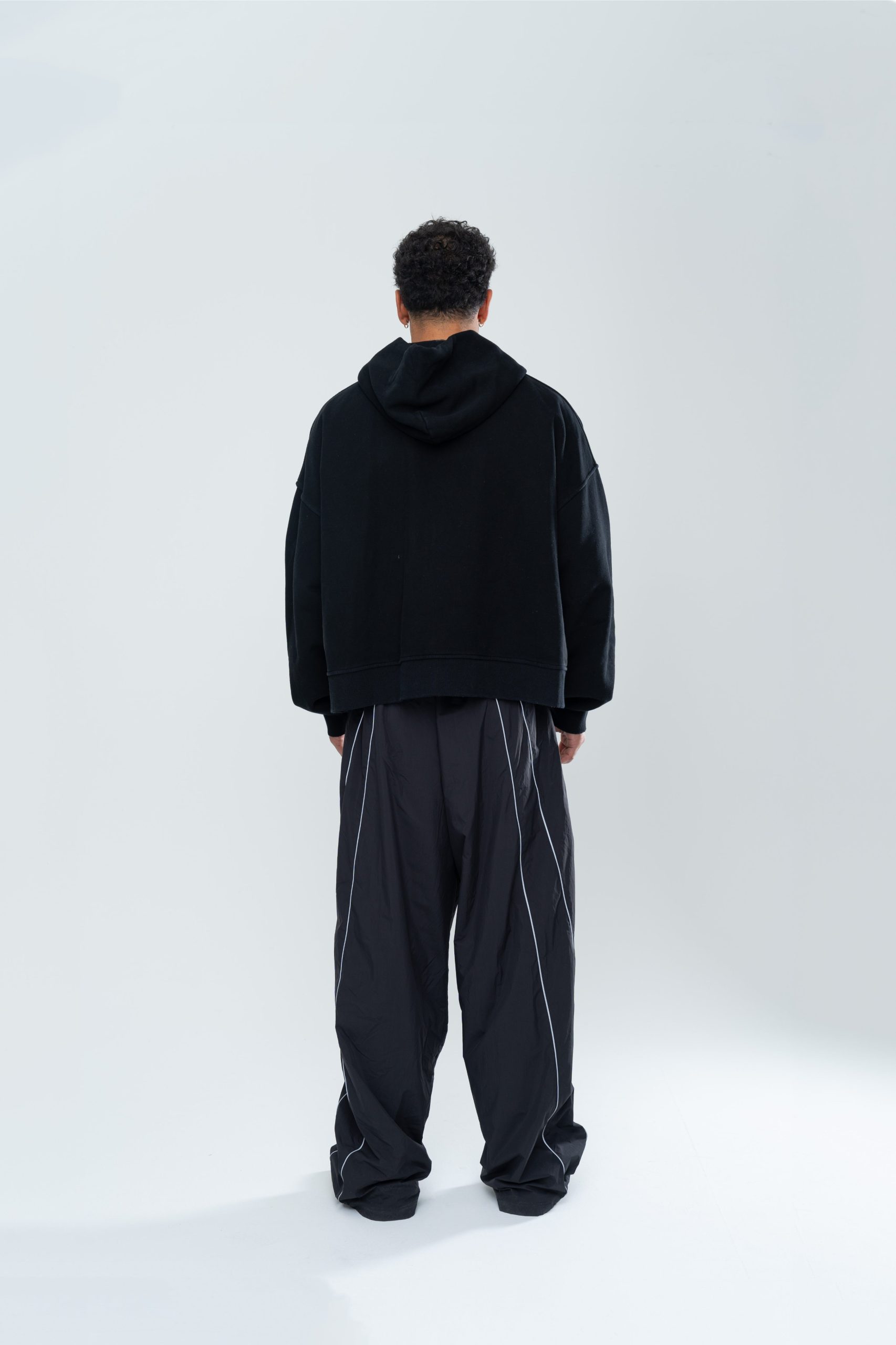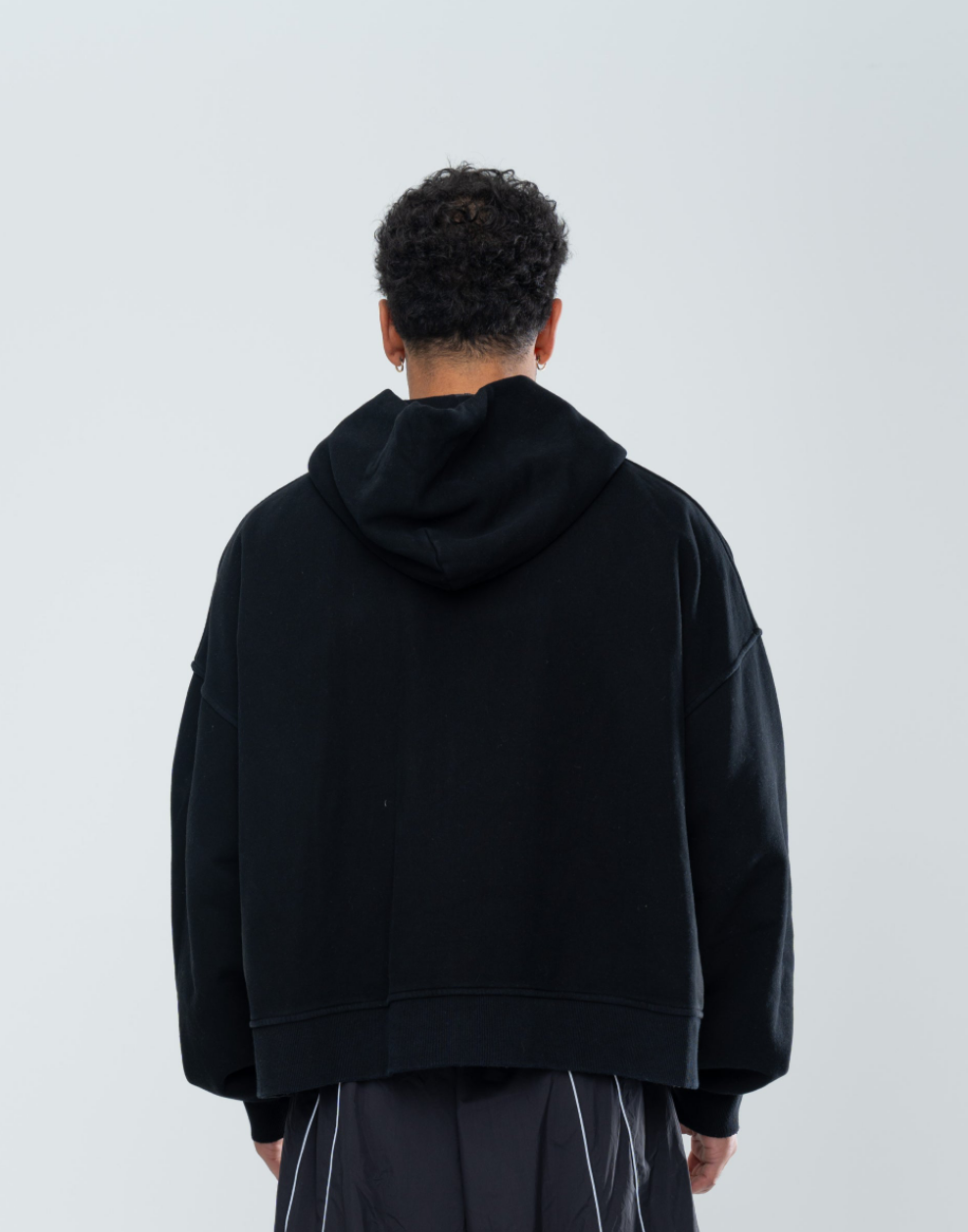 The Cropped Double Zip Hoodie is constructed with an oversized boxy silhouette and an ultra-premium heavy-weight brushed french terry cotton. Hand distressing details throughout the hem and cuffs provide a unique finish for each garment. Finished with a 2-way zip for fit customization and screen printed branding to the front.