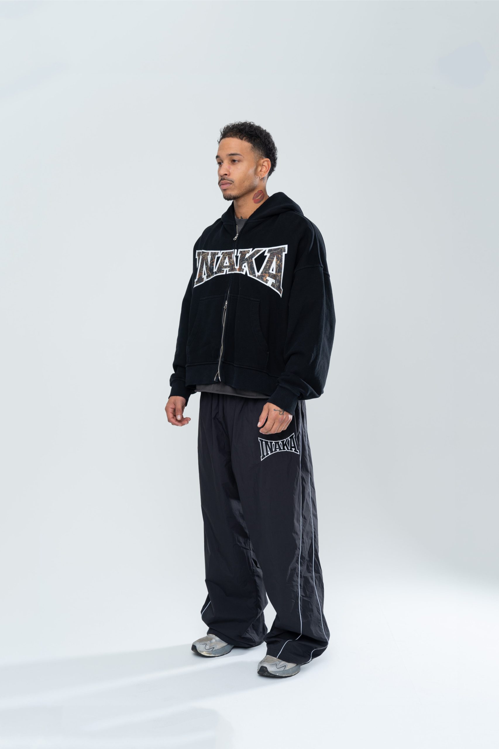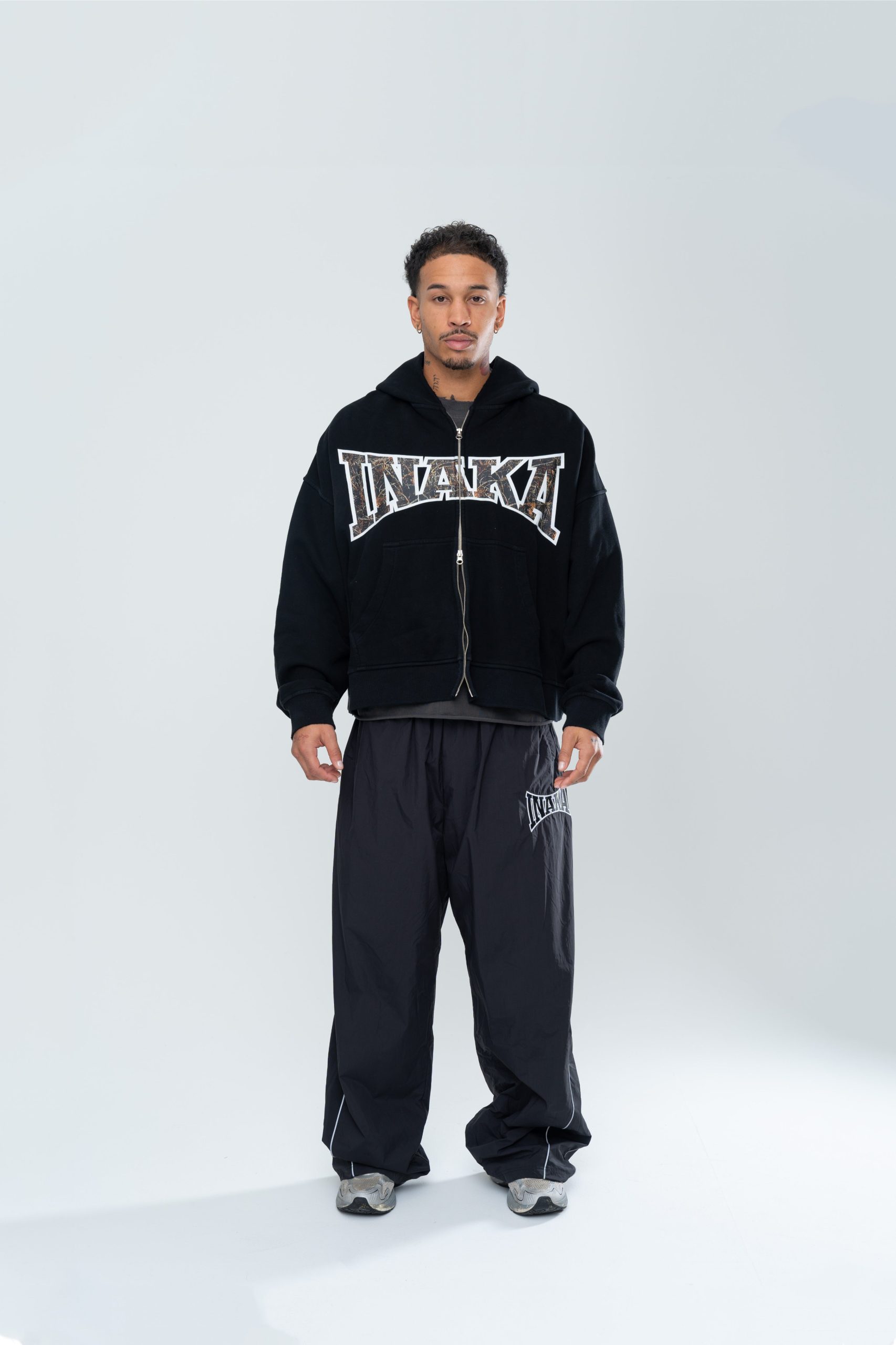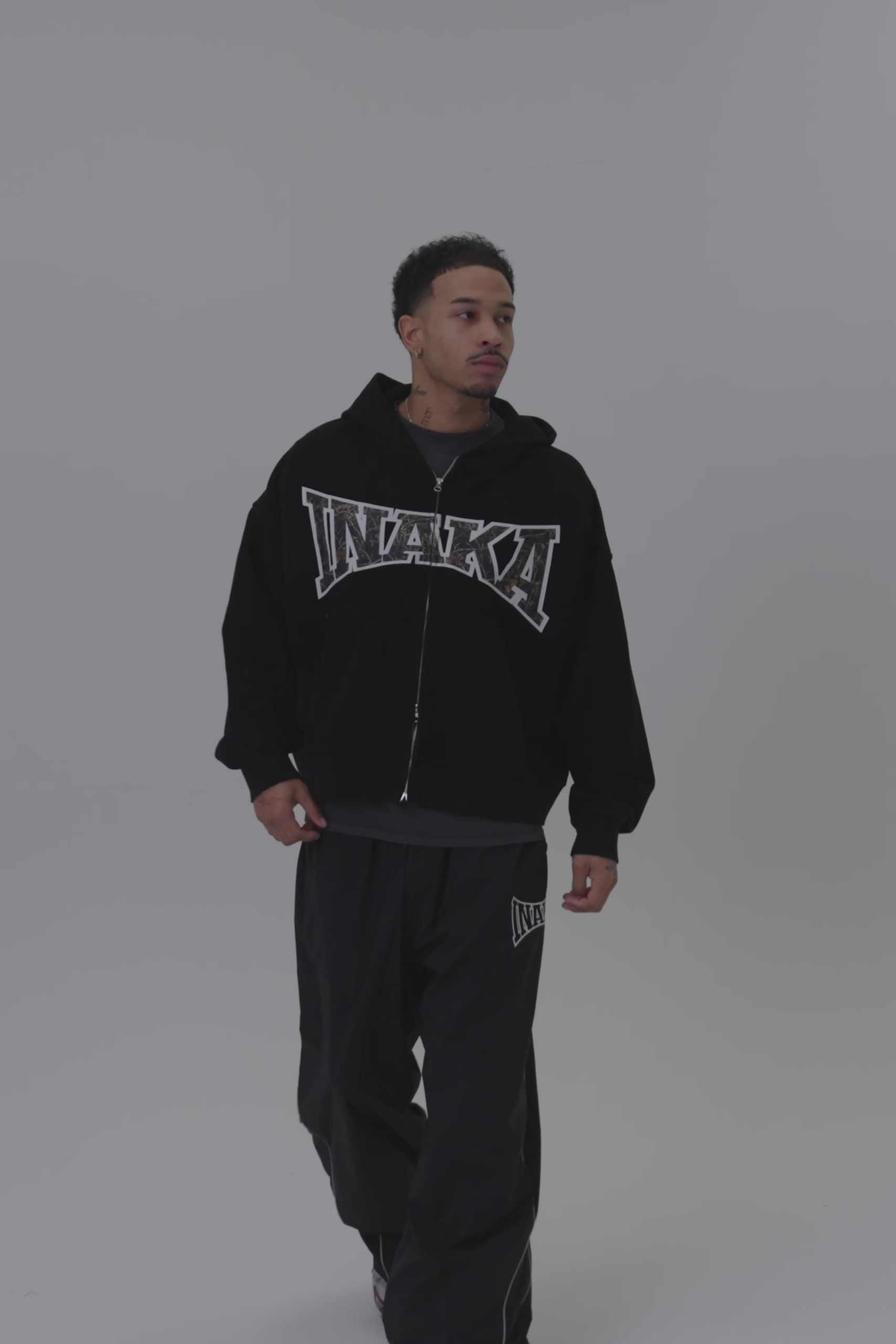 The Cropped Double Zip Hoodie is constructed with an oversized boxy silhouette and an ultra-premium heavy-weight brushed french terry cotton. Hand distressing details throughout the hem and cuffs provide a unique finish for each garment. Finished with a 2-way zip for fit customization and screen printed branding to the front.